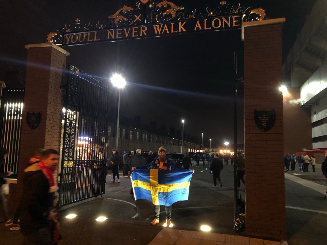 I was staying in Liverpool and considered walking to Anfield as I had a long time until kick off but was talked out of it by my wife so I boarded the bus which dropped me off right in front of the Kop, which looked amazing from the roadside.