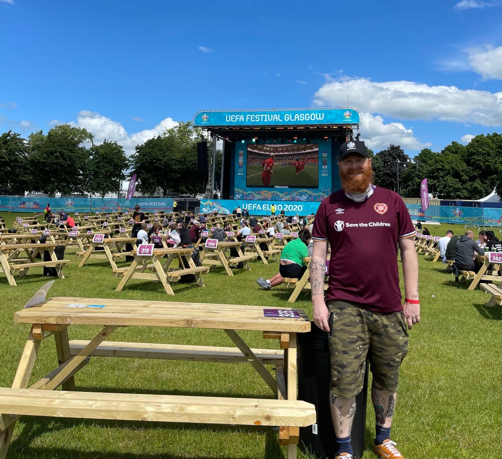 After being sent to the wrong part of Glasgow Green and missing kick off on Monday, I now knew the right way to get into the fan zone so made it with 15 minutes to spare. Had a good chat with a bloke selling Scotland flags, scarves and badges outside about Hearts and the game tomorrow. A lot of the security and volunteers enjoyed giving me stick for wearing my Hearts shirt.
