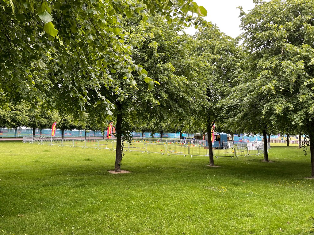 The walk wasn’t too bad about 15 mins or so but it wasn’t without incident as a sea of Scotland fans were heading back into the city centre after their 2-0 loss to Czech Republic in the 1400 kick off, a fan asked me for a lighter to which I politely said “No, sorry I don’t smoke”, to which he replied with disgusting homophobic insult back (people wonder why others have a low view of football fans). Once I reached Glasgow Green it was a little confusing as to where the entrance was as I headed to the People’s Palace entrance to the park and after eventually being directed to the right place to be I began my security checks to get in. I was checked via a security scanner and had my bag searched, oddly the CoVid test bus had finished testing at 1700.