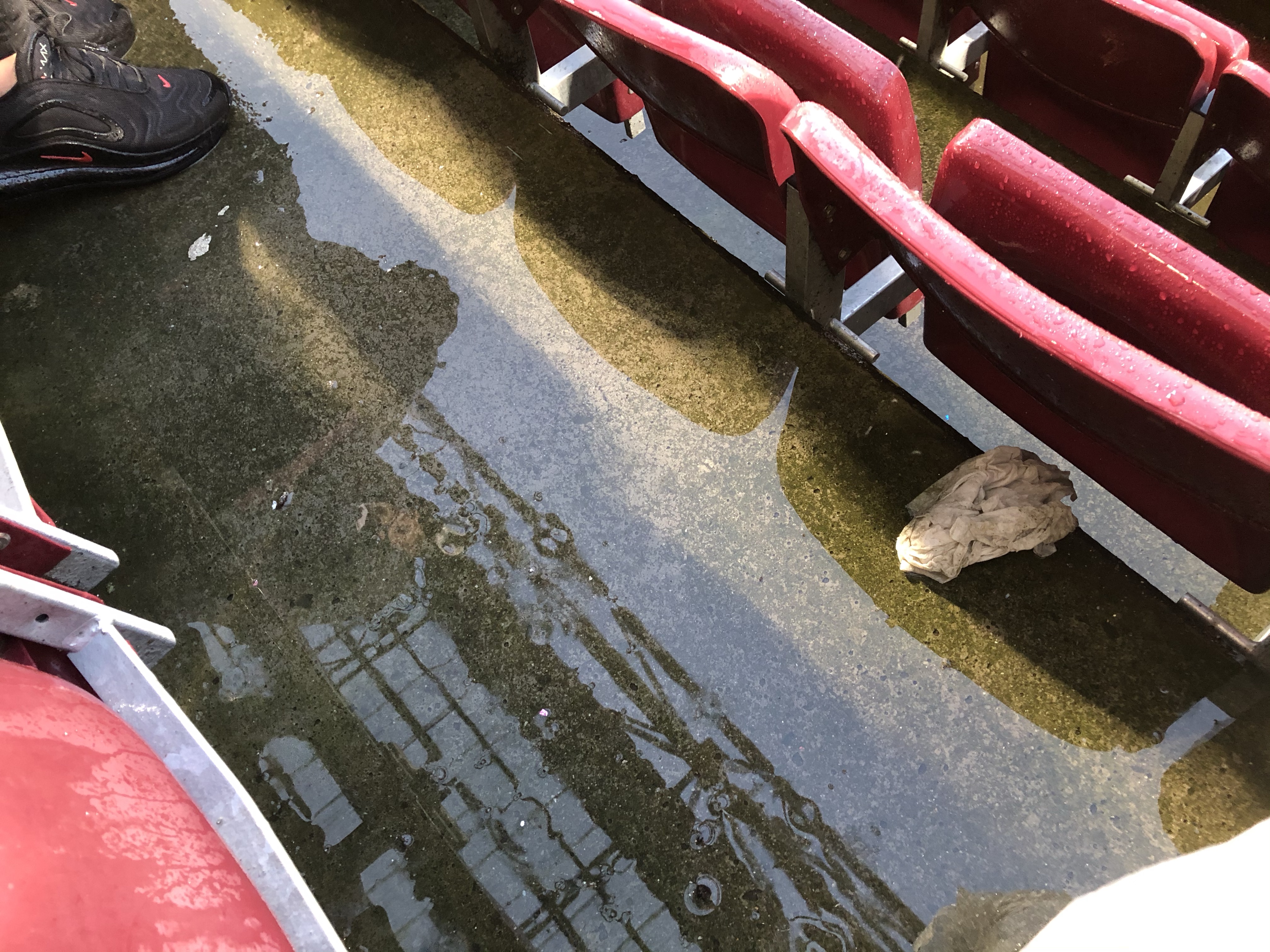 I thought covering my legs in a poncho to keep dry would be a good idea but the rain ran off my legs soaking my trainers and my parka was soaked through. Around my seat was flooded and set the stage for great conditions for a game of football.